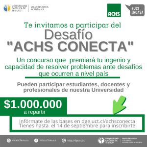 Hasta el lunes 14 de septiembre a las 23.59 estarán abiertas las postulaciones a este desafío en la página https://dge.uct.cl/achsconecta/, donde pueden formarse equipos de estudiantes junto a docentes o profesionales de la Universidad. El 21 de septiembre será el comienzo de este bootcamp con los equipos inscritos, el que finalizará el 25 de septiembre con la premiación del primer, segundo y tercer lugar, los que recibirán premios de $500.000, $350.000 y $150.000, respectivamente.